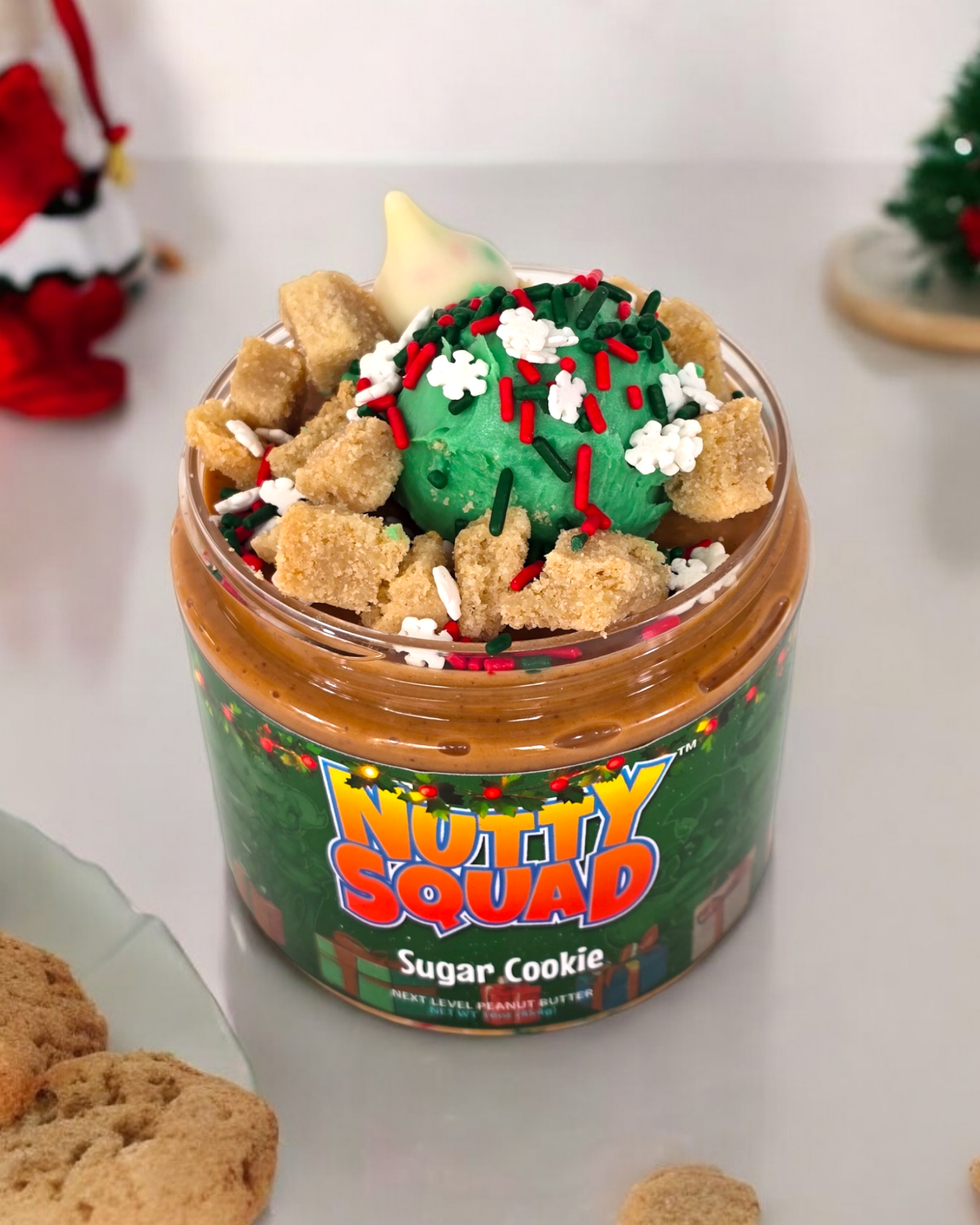This merry mix of our homemade white chocolate peanut butter, sugar cookie pieces, white chocolate chips, holiday sprinkles, a dollop of vanilla frosting and a sugar cookie peanut butter cup on top delivers sweet Christmas cookie comfort in a jar.