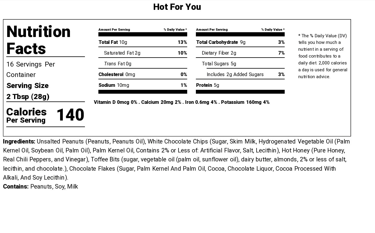 Sweet heat at its finest. Our homemade white chocolate peanut butter swirled with hot honey, layered with crunchy toffee pieces, hot honey peanuts and chocolate flakes for a bold, irresistible bite.