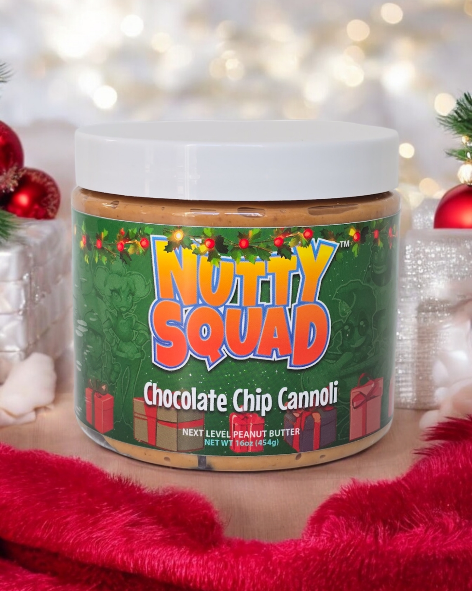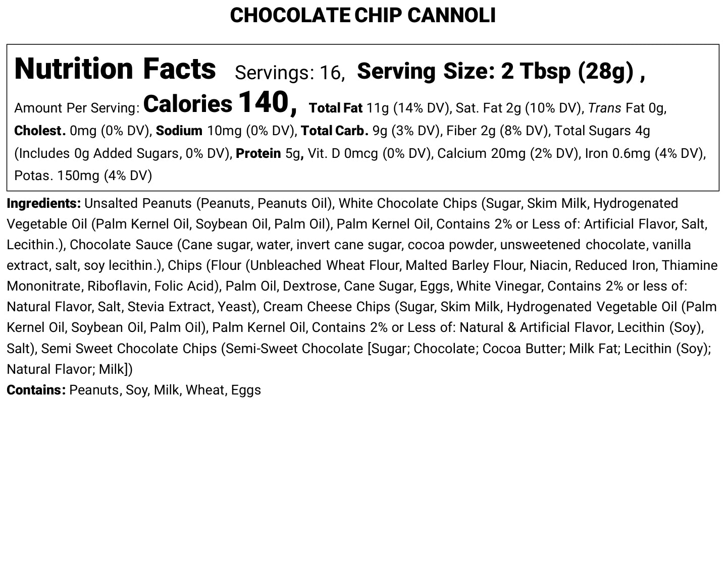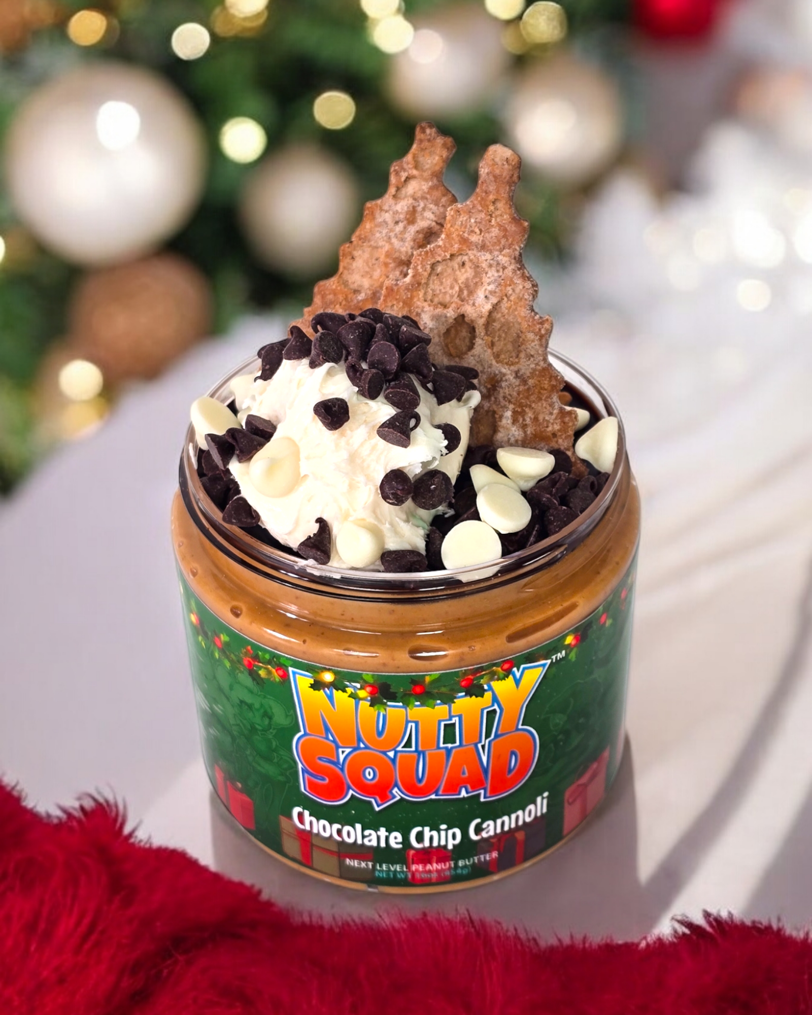 A cozy mix of our homemade white chocolate peanut butter, chocolate sauce, mini semi-sweet chocolate and cream cheese chips, mini powdered cannoli chips and a dollop of cream cheese frosting that tastes like a soft, festive chocolate chip cannoli fresh from a holiday bakery.