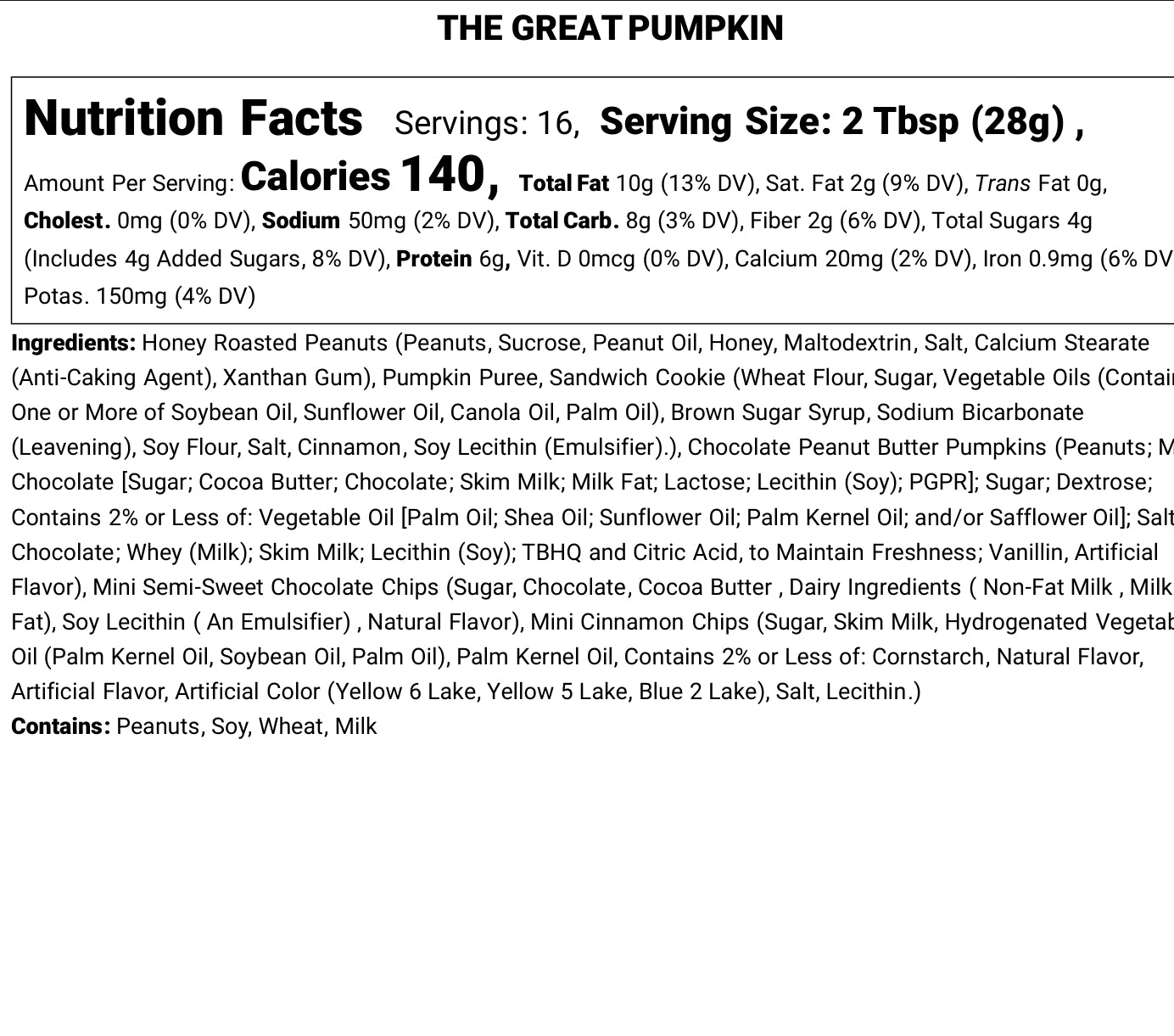 Fall never tasted better. We start with our homemade honey roasted peanut butter, pumpkin spice swirl, Biscoff cookie pieces, mini semi-sweet chocolate and cinnamon chips and mini chocolate covered peanut butter pumpkins.